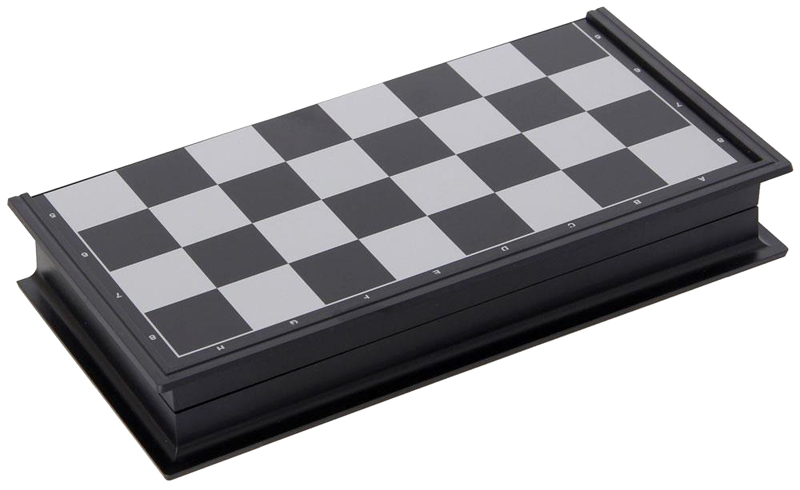 Schwarze, zusammenklappbare Kunststoffkassette mit aufgedrucktem Spielfeld mit Platz zum Aufbewahren der Spielfiguren.