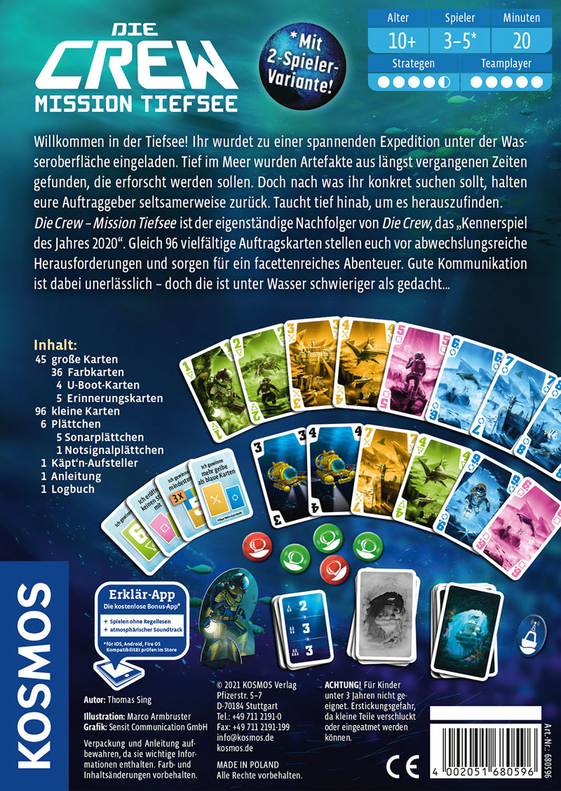 Nur im Team wird diese Mission ins dunkel Unbekannte gelingen. Auf jeder Karte erfährst du, welche Herausforderungen auf dich warten. Wenn jede Aufgabe richtig erfüllt ist, gelangt deine Crew ans Ziel. Die spannende Herausforderung: Die Kommunikation im Team ist in der Unterwasser-Welt nur eingeschränkt möglich.