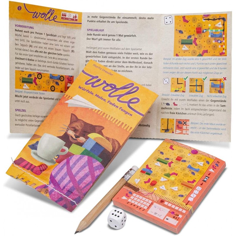 Im Spiel Wolle tobt Katze durch das Wohnzimmer auf der Jagd nach dem bunten Wollknäuel. Wer legt den Faden am geschicktesten aus und lockt die Katze zu ihrem Lieblingsspielzeug? Ihr dürft den Faden um so viele Felder verlängern, wie der Würfel zeigt, doch dabei nur einmal abknicken.