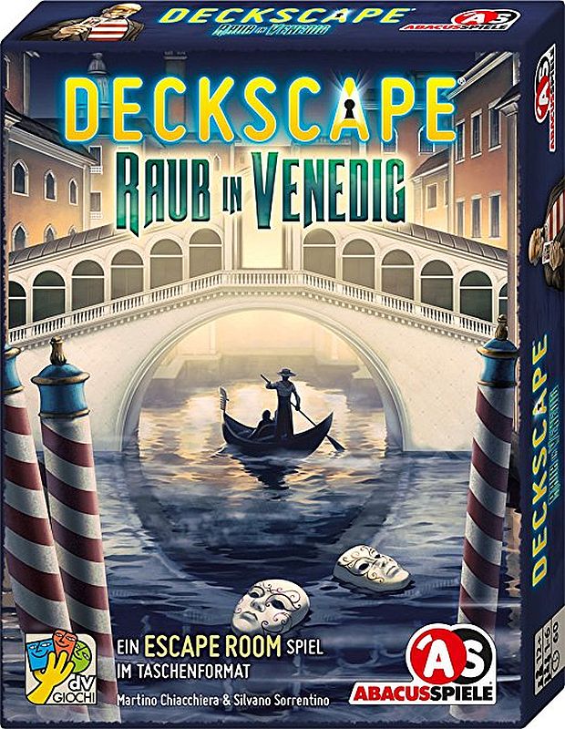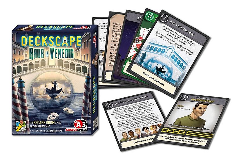 Deckscape - Raub in Venedig ist ein Escape Room Spiel, ein Kartenspiel im Taschenformat. Ein Abenteuerspiel, in dem die Spieler eine Reihe von Rätseln lösen, indem sie Hinweise und Strategien verwenden, um das Ziel zu erreichen. Die Spieler erhalten eine Zeitbegrenzung, um die geheime Handlung zu enthüllen, die in den Räumen versteckt ist.