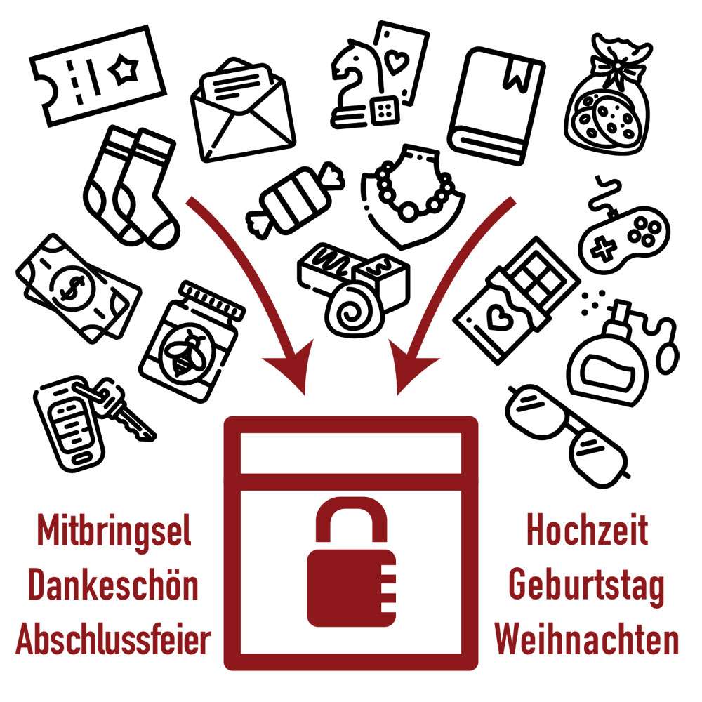Befülle die Rätselbox mit einer grossen oder kleinen Überraschung und lass den Beschenkten das Rätsel der Rätselbox lösen.