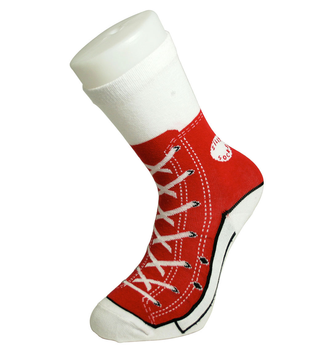 Diese lustigen Socken im Turnschuh-Stil rot bedruckt sind ideal für das Benutzen in heiklen Räumen, wie Wohnraum, Kinderzimmer oder Gemeinschaftsräumen.