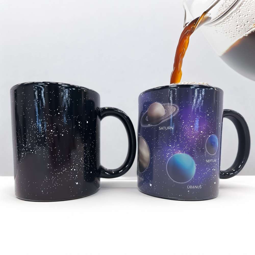 Tasse, die sich durch Wärme verändert. Giess eine heisse Flüssigkeit in die Tasse und das Bild wechselt: aus dem zuerst dunklen Sternenhimmel erscheinen plötzlich die Planeten unseres Sonnensytems. Ein toller Effekt und ein schönes Geschenk für Astronomie-Fans.