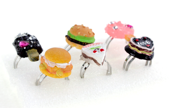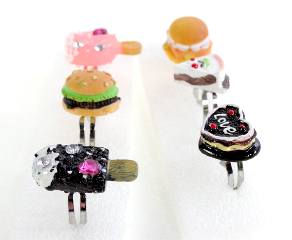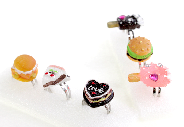 Fingerring mit lustigen Esswaren Sujets: Kuchen, Kuchenstücke, Hamburger, Glacé und Eis.