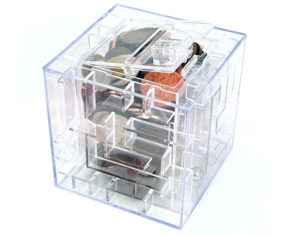 Um diese Spardose zu öffnen, muss man eine Murmel durch ein kompliziertes Labyrinth dirigieren.