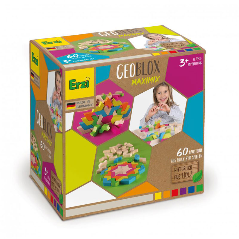 Geoblox Maximix sind farbige Bausteine aus Holz zum kreativen Erstellen von vertikalen Bauten oder horizontalen Bildkompositionen.