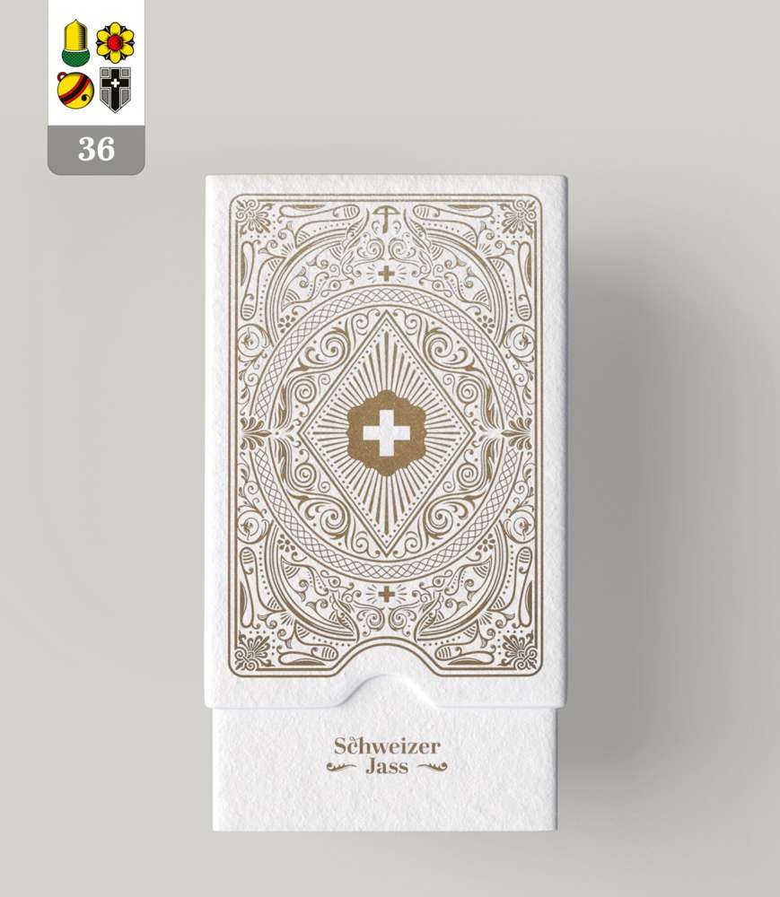 Klassische, hochwertige Schweizer Jasskarten. Leicht modern überarbeitet. In eleganter weisser Schiebeschachtel. Hergestellt in der Schweiz.