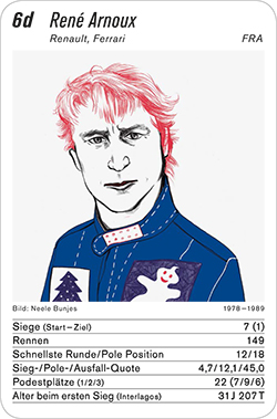 Jede Karte enthält Informationen zur Teilnahme an Anzahl Siege, Anzahl Rennen, schnellste Rennrunde, Anzajl, Podestplätze, Alter beim ersten Sieg. Die Angaben und Zahlen sind immer wieder interessant und aufschlussreich, das ganz Besondere sind aber die Illustrationen, welche überraschen und dem Spiel meine gewisse Fröhlichkeit bringen.