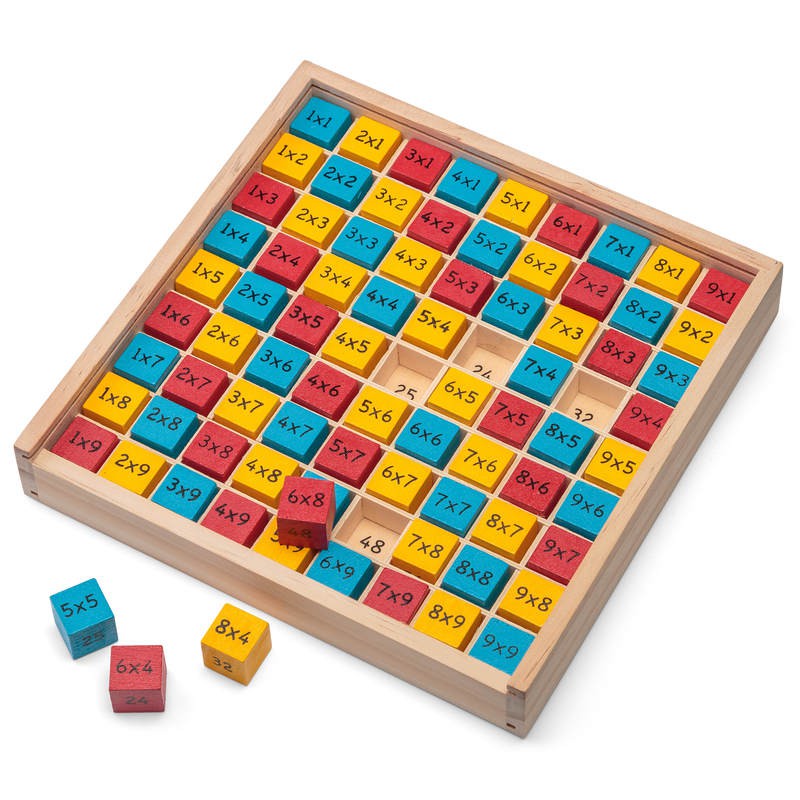 Der Kasten verfügt über 81 Nischen, in welche die bunten Würfel platziert werden. Auf jedem Würfel ist eine Multiplikationsaufgabe zu lösen, in der Nische ist das Resultat gedruckt.