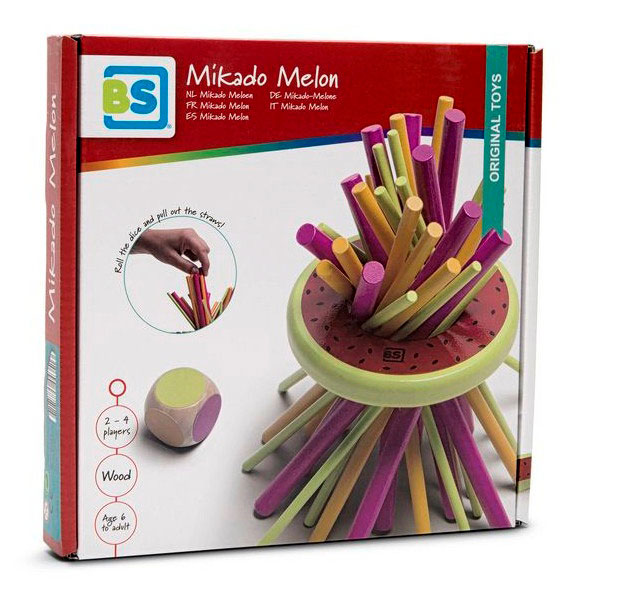 Die in unterschiedlichen Farben lackierten Mikado-Stäbchen aus Holz werden durch eine Melonenschale gesteckt. Mit einem Würfel wird die Farbe ausgewürfelt – jetzt muss der Mitspieler den Stab der entsprechenden Farbe aus der Melone ziehen. Dabei darf die Melone beim Herausausziehen der Stäbe nicht auf den Tisch fallen. Jeder Stab bringt unterschiedliche Punkte ein.