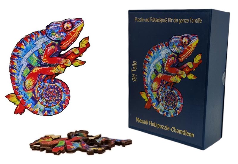 Dieses Puzzle gibt es in 5 verschiedenen Varianten wie Löwe, Chamäleon, Elefant.