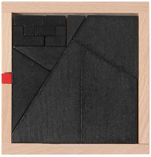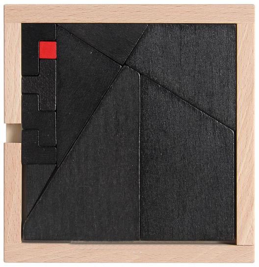 Der Holzrahen ist gefüllt mit schwarzen eckigen Formen. Ausserhalb hat es einen kleinen roten Würfel, welcher zusätzlich im Rahmen platziert werden soll. Das kann doch nicht gehen. Wie soll das gehen?