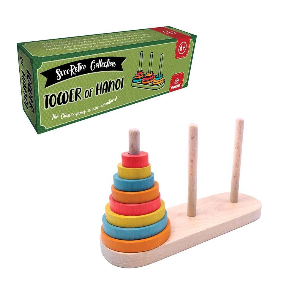 Die Türme von Hanoi ist ein beliebtes mathematisches Knobelspiel. Es fördert strategisches Denken und sequenzielles Denken. Diese Variante ist aus Buchenholz und mit farbigen Ringen.