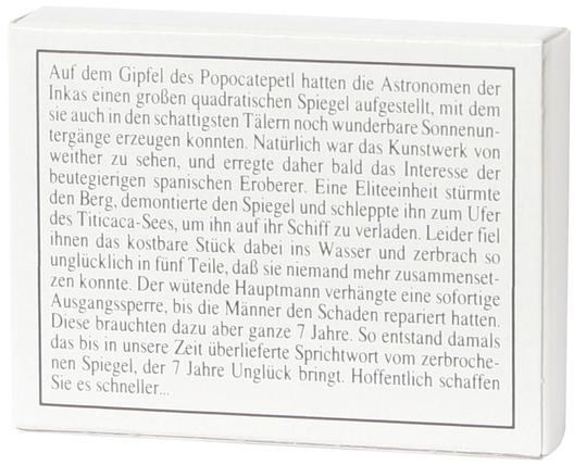 Die Spanier zertrümmerten den Inkas einen Spiegel in fünf Teile, was sieben Jahre Unglück verheisst! Wie lange brauchen Sie für die Reparatur?