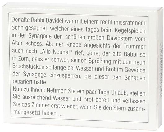 Rabbi Davids Sohn schoss beim Kegelspielen den David-Stern vom Altar. Zur Strafe musste er die neun Teile wieder zum Stern zusammenbauen!