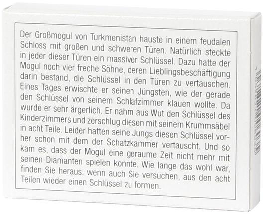 Weil der Grossmogul von Turkmenistan versehentlich den Schlüssel seiner Schatzkammer in acht Teile zertrümmert hat, kommt er nicht mehr an seine Schätze! Helfen Sie ihm!