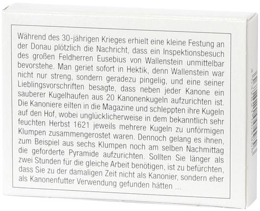 Feldherr Eusebius von Wallenstein kommt zur Inspektion. Seine Lieblingsvorschrift besagt, dass alle Kanonenkugeln zu einer Pyramide gestapelt sein müssen. Blamieren Sie Ihre Festung nicht! Das Puzzle Die Kugelpyramide besteht aus 6 Teilen.