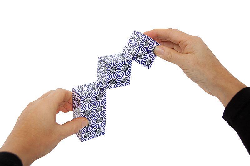 Wenn Sie das Puzzle ohne Kraftaufwand drehen, ändert die Form der Geometrie. 100 verschiedene Formen sind möglich und eine grosse Herausforderung selbst für Puzzle-Profis.