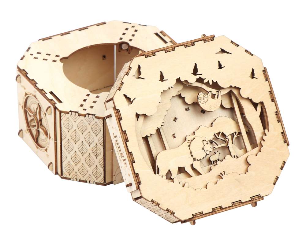 Nach dem Zusammenbau dieses aus lasergeschnittenen Präzisions-Holzteilen bestehenden Kistchens erhält man einen wunderbaren Aufbewahrungsort für kleine Geheimnisse, der durch einen auf dem physikalischen Prinzip der Zentrifugalkraft basierenden Geheimverschluss geschützt ist.