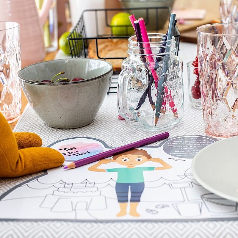Damit sich die Kinder noch länger mit den Übungen beschäftigen und diese auch verinnerlichen, können die Papier-Tischsets individuell bemalt werden.