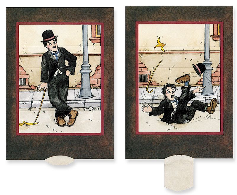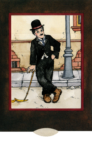 Die Lebende Karte Charlie ist eine faszinierende Geschenk-Karte mit Lamellentechnik. Sobald man an der Lasche zieht, ändert sich das Bild und Charlie (Charlot) Chaplin erinnert mit seinem ungeschickten Sturz an die gute alte Stummfilmzeit.