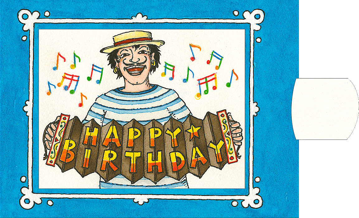 Die Ziehkarte Karte Happy Birthday ist eine faszinierende Geschenk-Karte mit Lamellentechnik. Sobald man an der Lasche zieht, spielt der Gondoliere auf seine Ziehharmonika den Happy birthday Song.