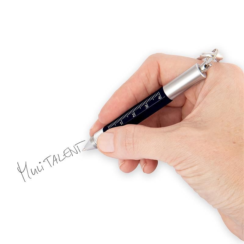 Touchpen, Lineal mit 4 cm Länge, Schlitz- und Kreuzschraubendreher und wer hätte es gedacht, schreiben kann er auch noch! Alles vereint in einem robusten Kugelschreiber aus Metall und immer griffbereit. Einfach aufschrauben und los gehts! Perfekt auch als Geschenk!