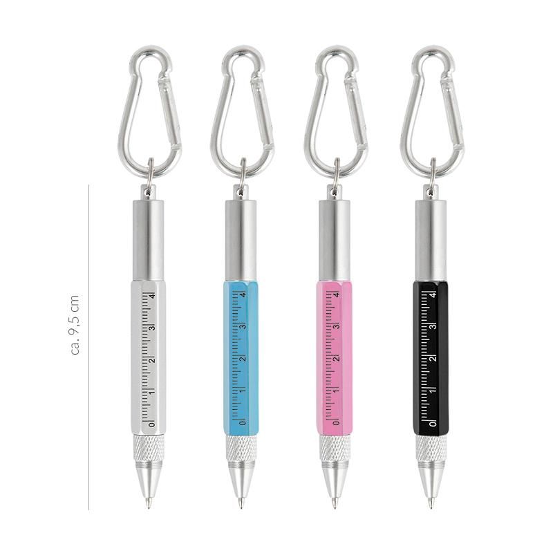 Be smart & clever! Für dich und alle, die mehr erwarten und es praktisch lieben, ist dieser Alleskönner-Kugelschreiber mit Karabiner und 5 verschiedenen Funktionen genau das Richtige!