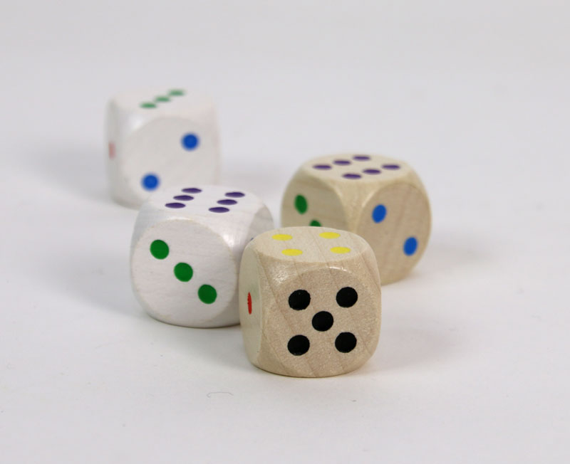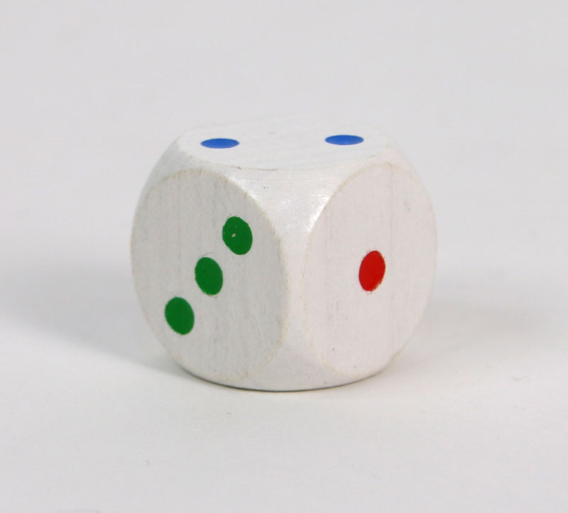Die Augen des Holzwürfels sind farbig in Rot, Blau, Grün, Gelb, Schwarz und Violett.