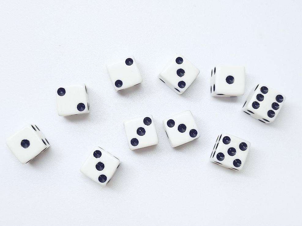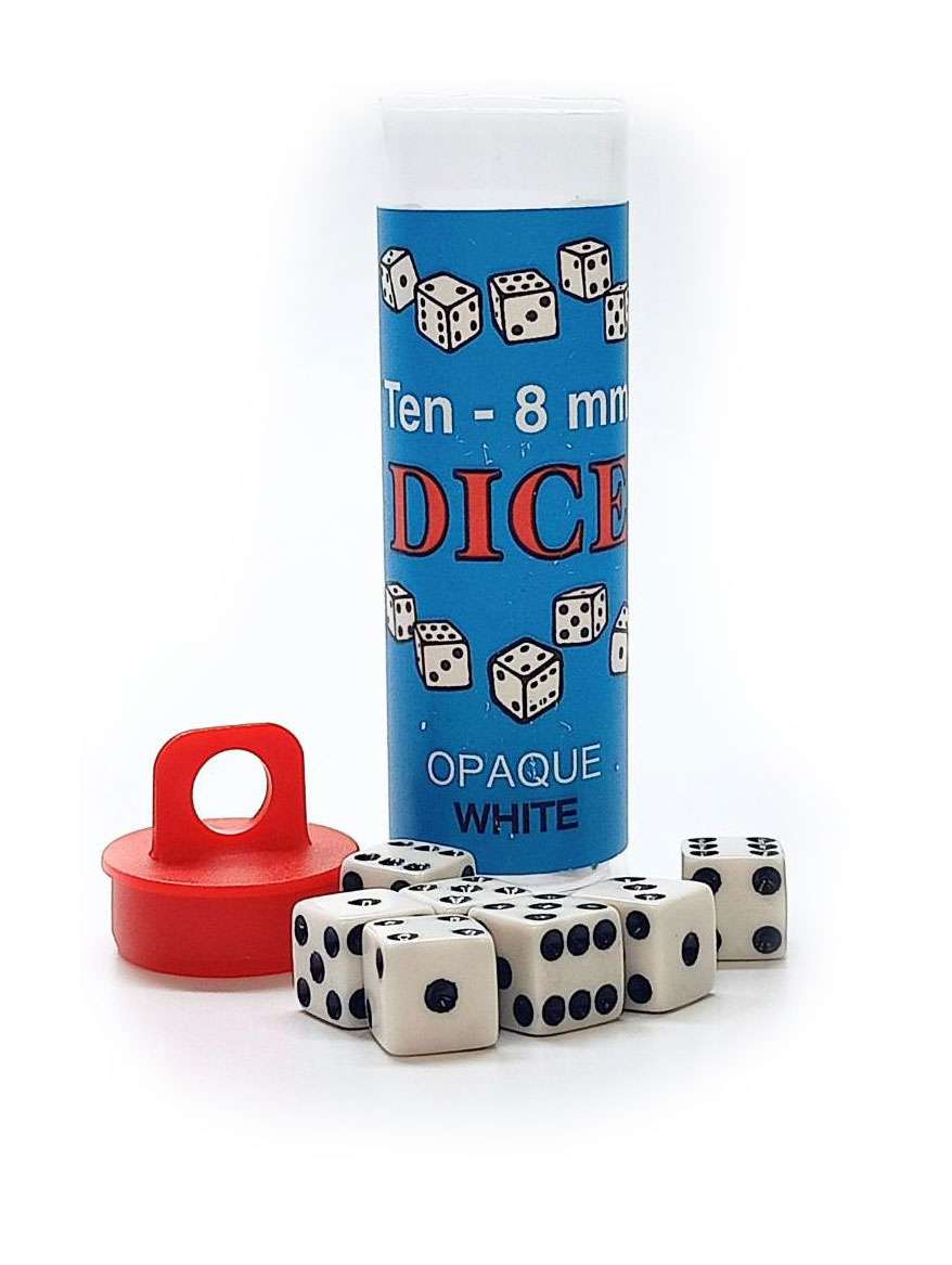 Röhrchen mit 10 weissen Würfeln. Die Würfel haben 6 Flächen, eine Kantenlänge von 8mm und zeigen Punkte von 1-6.